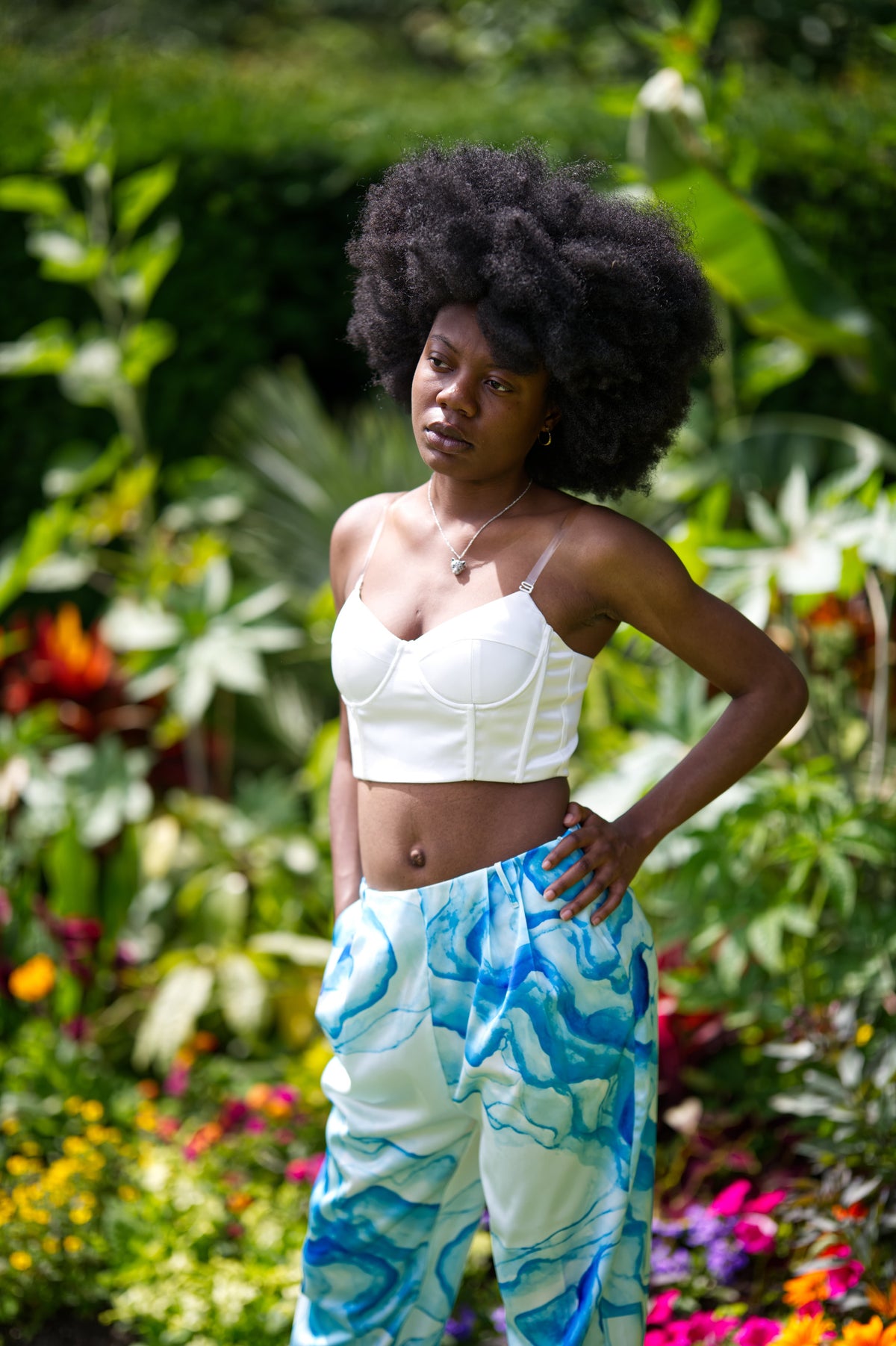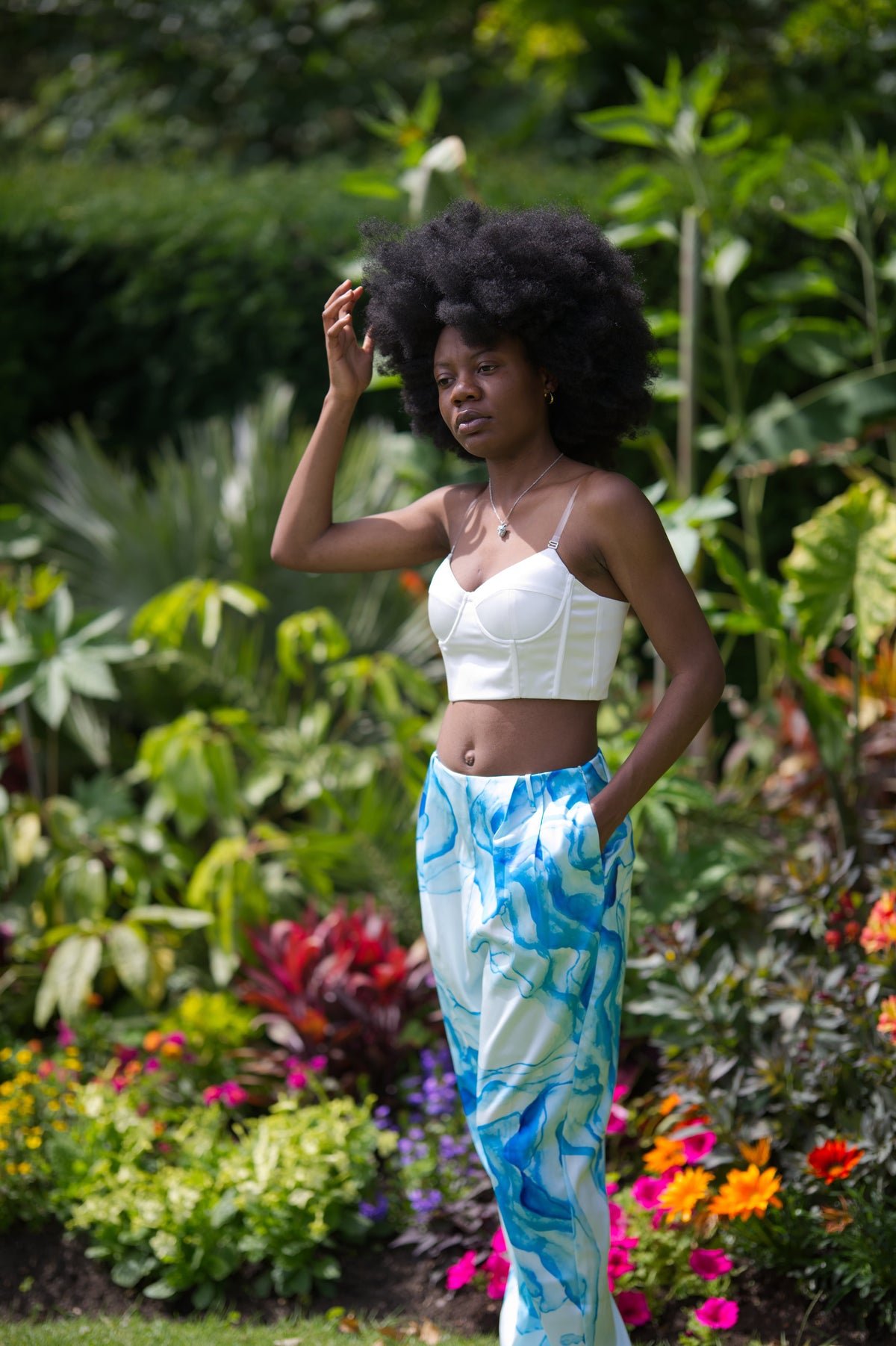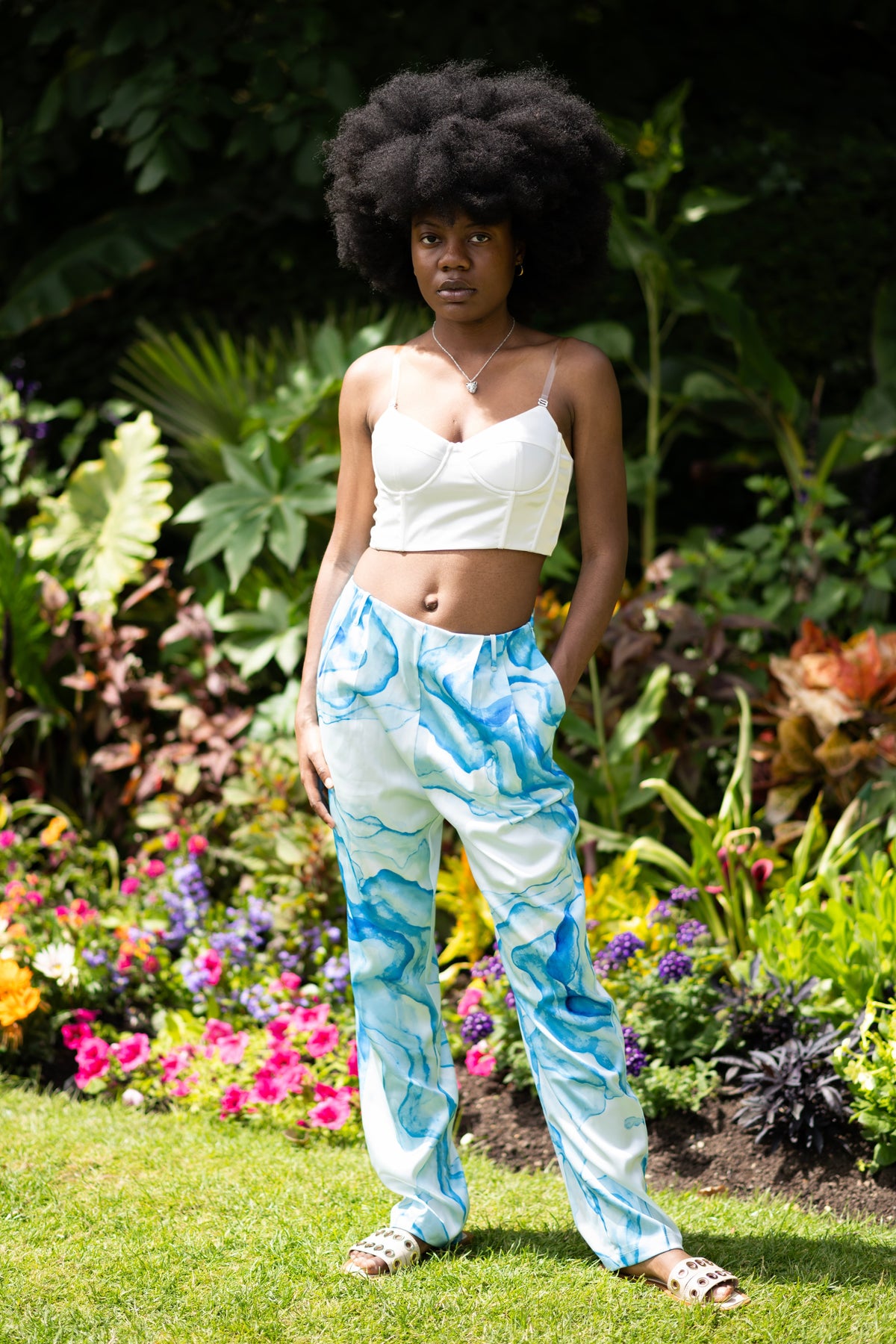 While it’s a gorgeous co-ord set, both pieces are versatile and can be styled separately. Pair the blue marble pants with a simple top for a more casual look or with a smart blazer for a polished evening ensemble. The white bustier can be worn with high-waisted jeans or a skirt for a chic night out. Whether worn together or separately, this set guarantees a bold and stylish statement for any occasion.