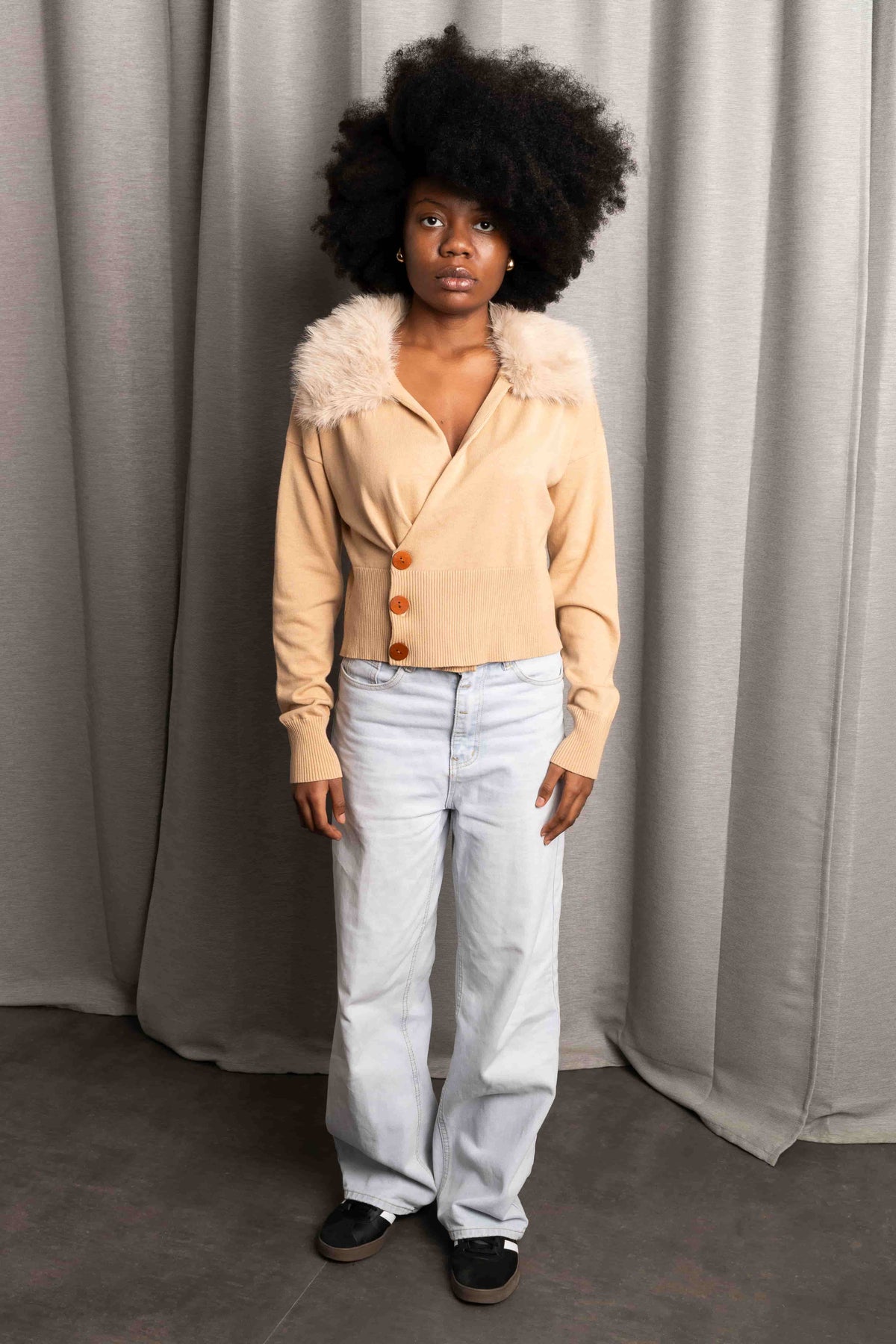 The Beige Fur-Collar Wrap Coat is the perfect addition to your cold-weather wardrobe, offering both warmth and style. Crafted from high-quality fabric, this coat features a removable and attachable fur-trimmed collar, allowing you to customize your look. Wear it with the fur for a premium, chic feel or without for a more casual vibe.The wrap style with three side buttons and the V-neckline give the coat a modern edge, while the waist-length cut ensures easy layering over any outfit. Whether you're dressing up or keeping it casual, this versatile coat provides the perfect combination of comfort and style. With its great quality and flexible fur collar, it’s the ideal choice for staying cozy and fashionable.