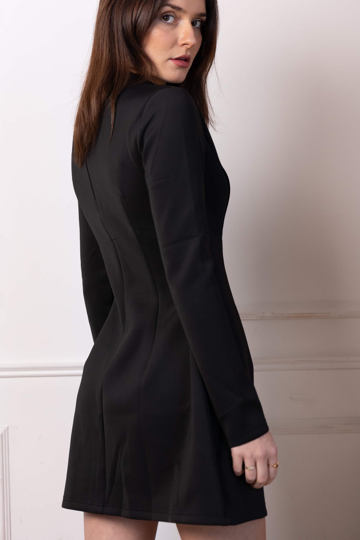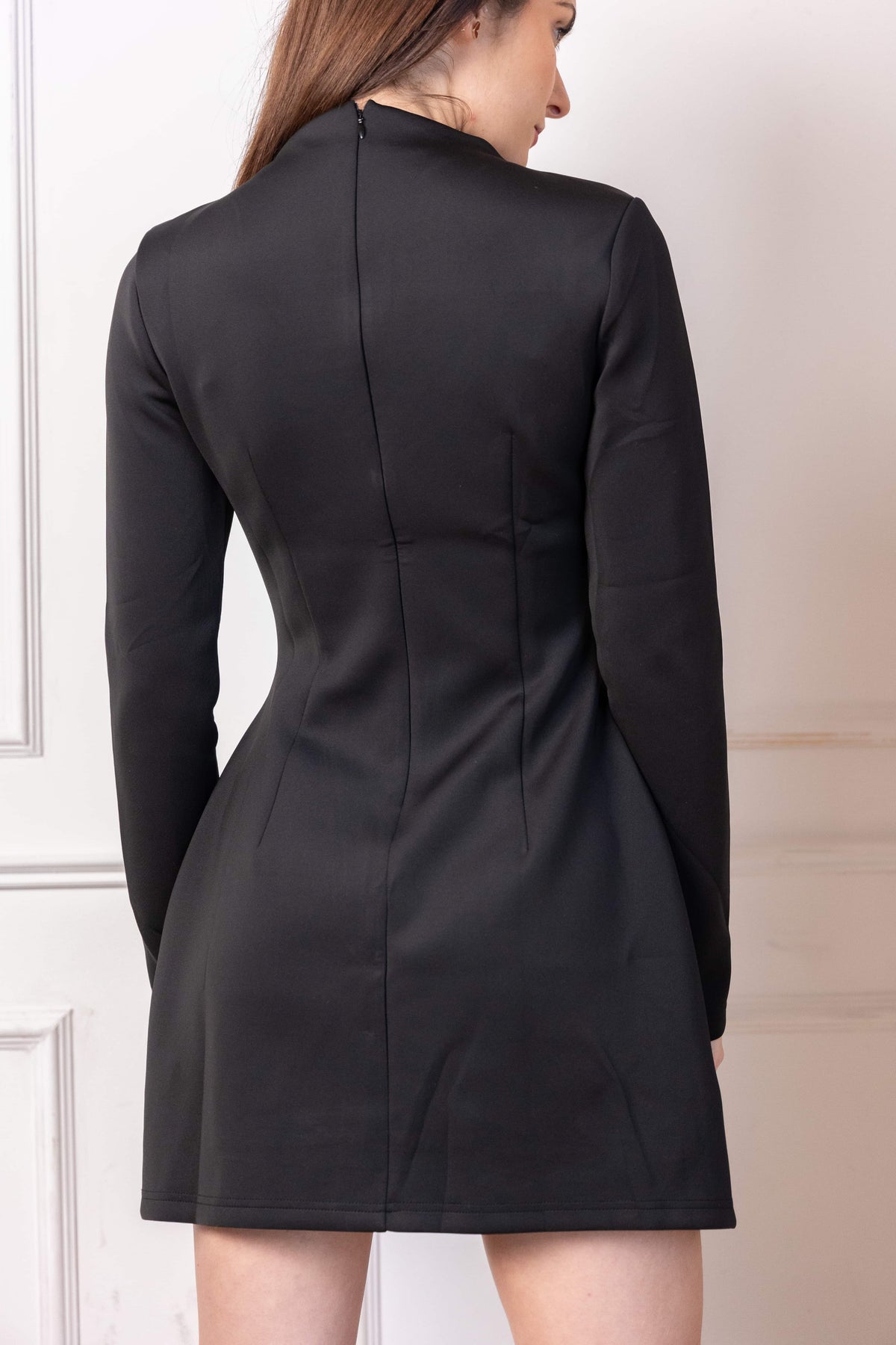 This high-neck dress is a game-changer for your wardrobe. Designed to highlight your natural curves, it’s made from stretchy fabric that fits comfortably and adapts to your body shape, ensuring it flatters all body types. The classic black color and minimalist design make it an essential piece that never goes out of style.With its slim fit and above-the-knee hemline, this dress creates a confident, modern look that’s perfect for any occasion. Whether it's a cocktail party, dinner, or evening out, this dress offers the right amount of style and comfort, making you feel as good as you look. A true wardrobe staple that turns heads and fits effortlessly into your lifestyle.