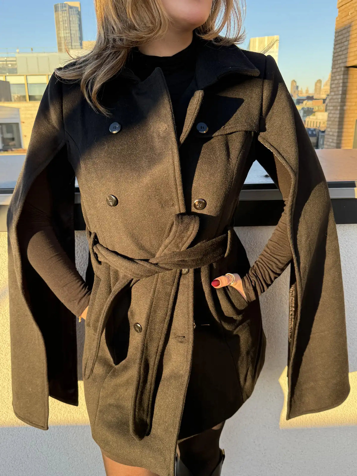 The Black Dramatic-Sleeve Wrap Coat is a reimagining of outerwear, designed to elevate your style while keeping you warm and comfortable. Its sleek V-neckline, tailored collars, and adjustable waist belt create a flattering silhouette suitable for different body types, while the unique, dramatic cape sleeves add a touch of modern elegance. Crafted from high-premium quality fabric, this versatile piece can also be styled as a single dress, offering multiple looks in one. The lightweight yet warm fabric ensures comfort in colder weather, and its knee-length design makes it a timeless investment piece that will last for years. This innovative coat, combining practicality with a bold aesthetic, is a unique take on traditional outerwear concepts, making it a chic and sophisticated choice for any occasion.