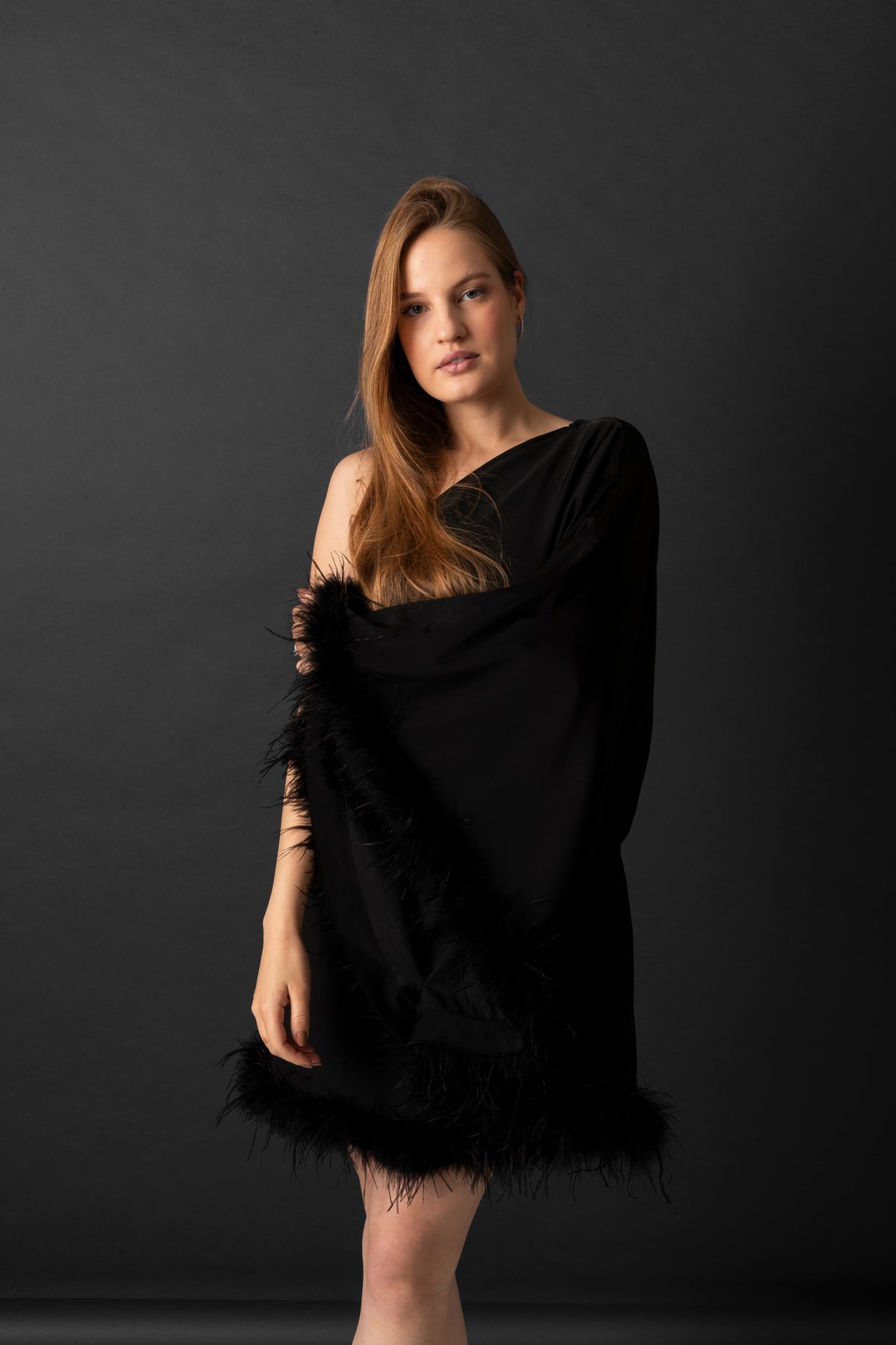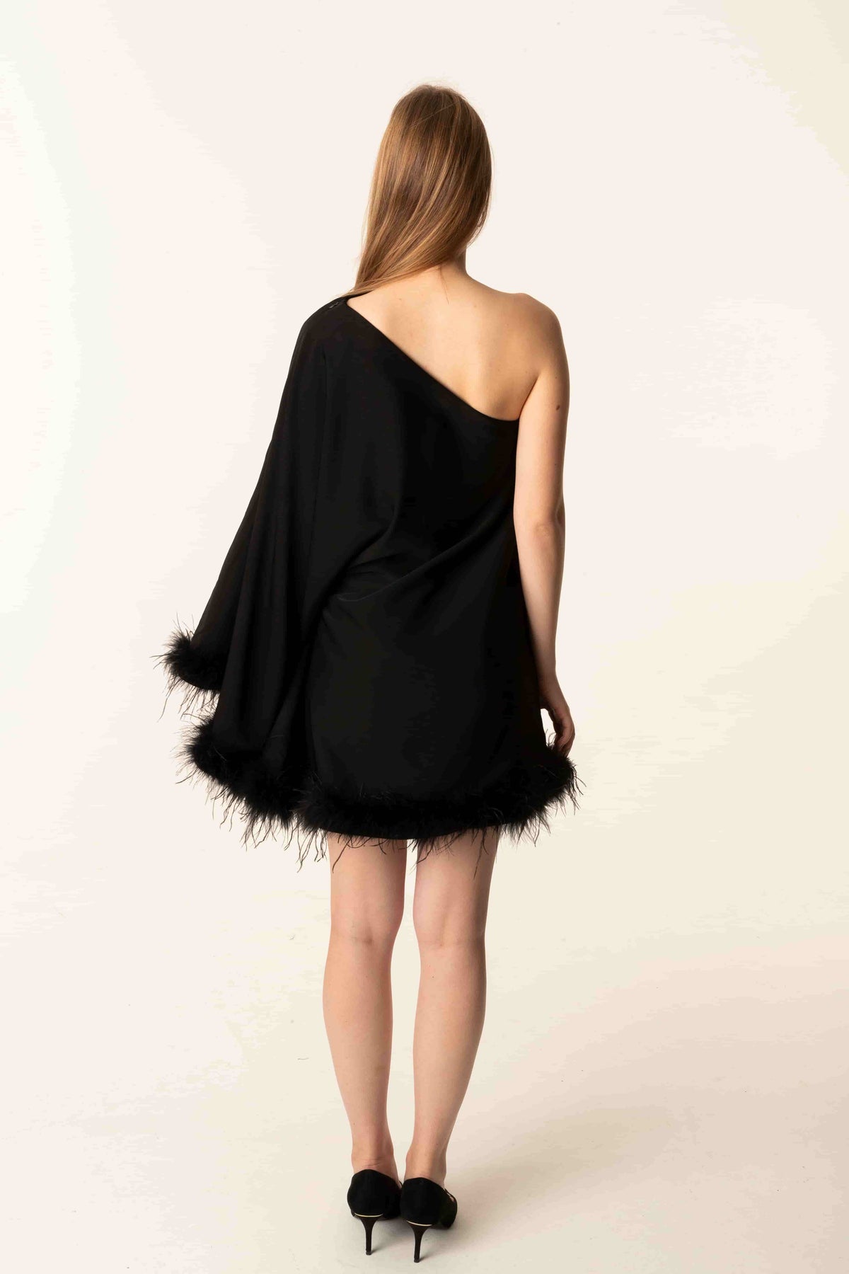 The Black Fur-Trim One-Shoulder Dress combines modern style with classic appeal. Its mid-thigh length and one-shoulder design add a touch of sophistication, while the open shoulder detail allows you to wear it on either shoulder, giving you the flexibility to customize your look.The luxurious black fur trim, adorning the lower circumference and extending to the sleeve area, adds a rich texture and a cozy touch. Perfect for evening events or upscale gatherings, this dress provides both comfort and high-fashion. Crafted from great-quality material, it’s a standout piece that exudes elegance and individuality.