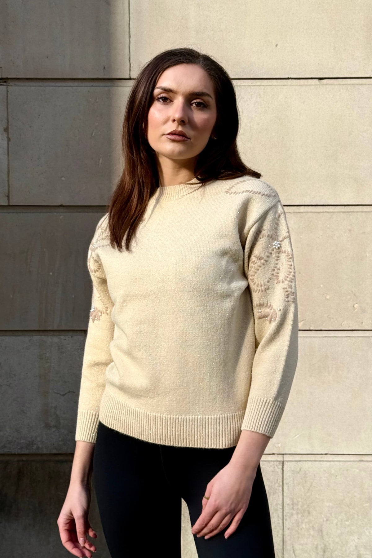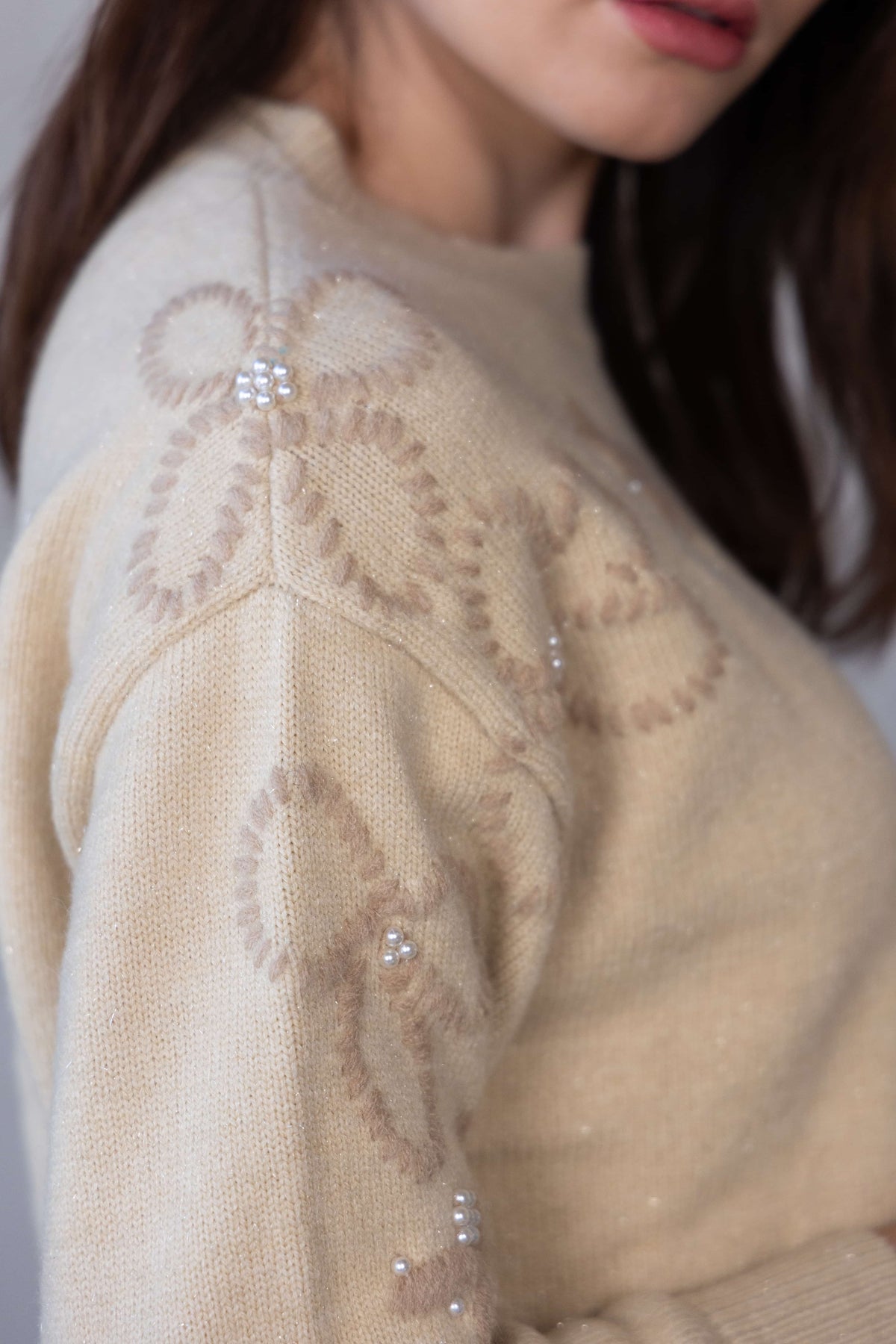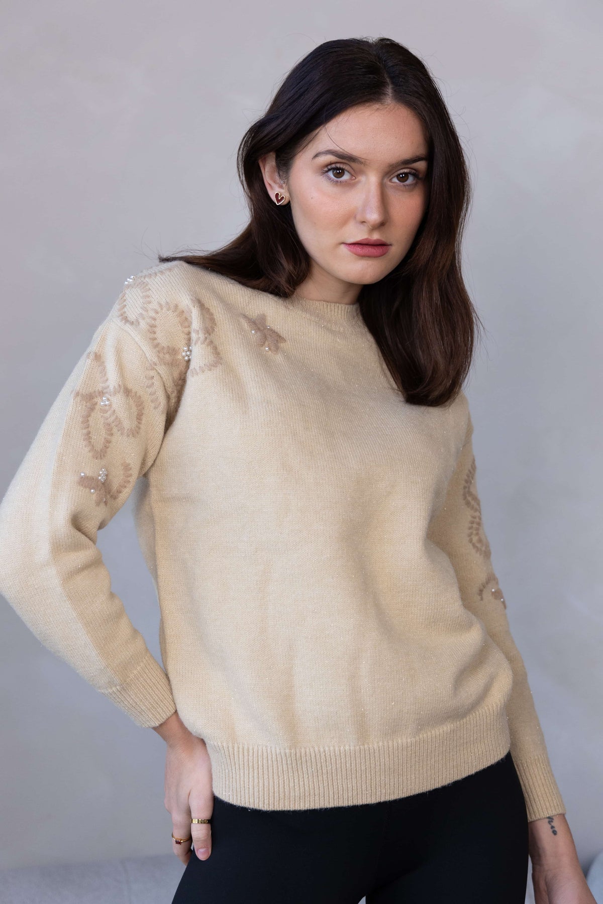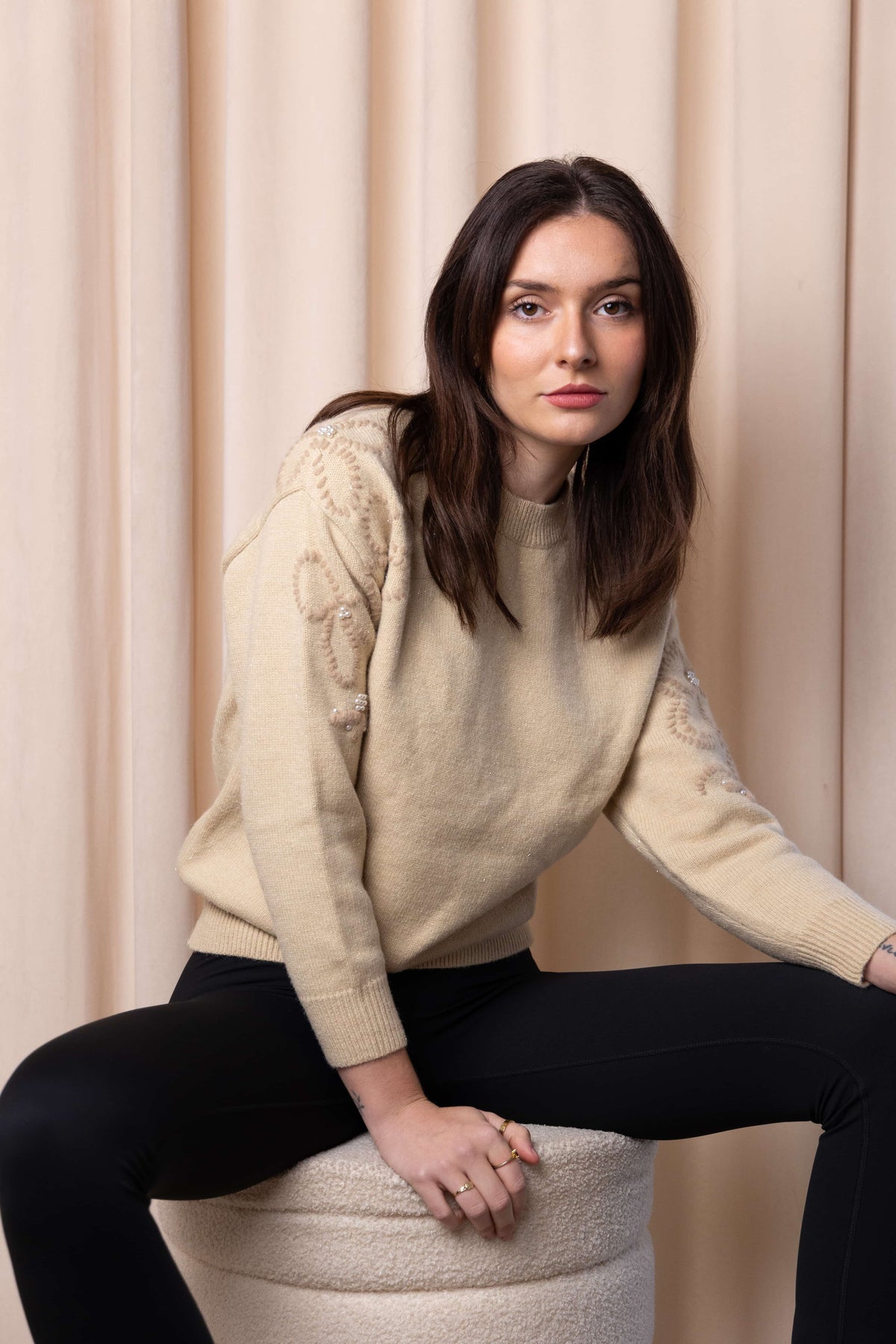This round-neck knit top combines comfort and style with a clean, minimal design. Made from a soft fabric blend, it offers a relaxed fit and long sleeves, keeping you warm in transitional weather. The top features embroidery with pearl details, adding a unique touch to the simple design.Whether you're going to brunch, running errands, or out for a casual outing, this top provides a chic, laid-back look. Its comfortable fit, timeless appeal, and standout embellishment make it a must-have in your wardrobe, offering both warmth and style for everyday wear.